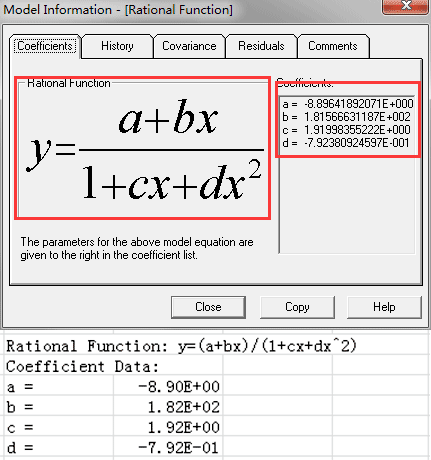 系數(shù)部分給出當(dāng)前模型的相關(guān)參數(shù)值——這些系數(shù)始終表示為 a、b、c、d 等。這些系數(shù)與模型部分中顯示的模型相匹配。如果系數(shù)列表超出了它們顯示的窗口范圍,則會出現(xiàn)一個滾動條,允許您滾動瀏覽參數(shù)。