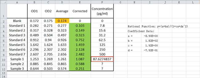 將X(OD)、a、b、c、d值分別帶入公式中,然后按鍵盤上的[ Enter ]鍵即可計算出濃度。為了得到最準(zhǔn)確的結(jié)果,建議預(yù)先確定合適的稀釋倍數(shù),確保稀釋后樣品中目標(biāo)蛋白的濃度落在標(biāo)準(zhǔn)曲線范圍內(nèi)。如果樣品已被稀釋,則計算時應(yīng)考慮稀釋因子。