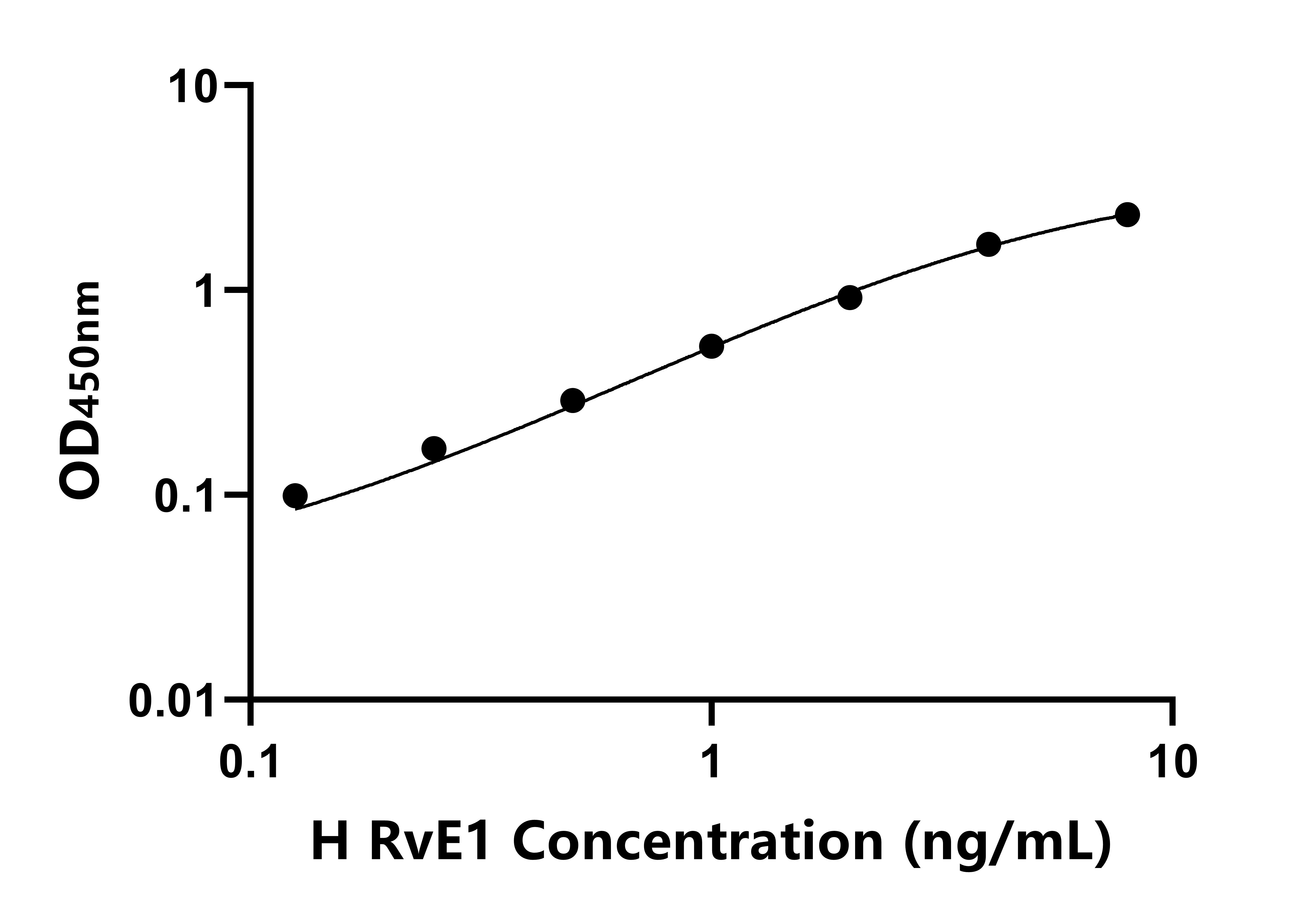 本試劑盒采用雙抗體夾心法ELISA技術(shù):將捕獲抗體包被于酶標(biāo)板上,捕獲樣品及標(biāo)準(zhǔn)品中的待測(cè)物RvE1,清洗后,再加入生物素標(biāo)記的檢測(cè)抗體進(jìn)行孵育后清洗,形成“捕獲抗體-抗原-檢測(cè)抗體”免疫復(fù)合物,隨后加入鏈霉親和素偶聯(lián)的辣根過氧化物酶進(jìn)行孵育,待孵育結(jié)束后清洗,接著加入TMB顯色后,若樣本中有待測(cè)物則顯藍(lán)色,加入終止液停止反應(yīng)。檢測(cè)過程中游離的成分均被洗去,用酶標(biāo)儀在450 nm處測(cè)OD值,顏色的深淺和樣品中的待測(cè)物的含量呈正比,通過繪制標(biāo)準(zhǔn)曲線計(jì)算出樣本中RvE1的濃度。