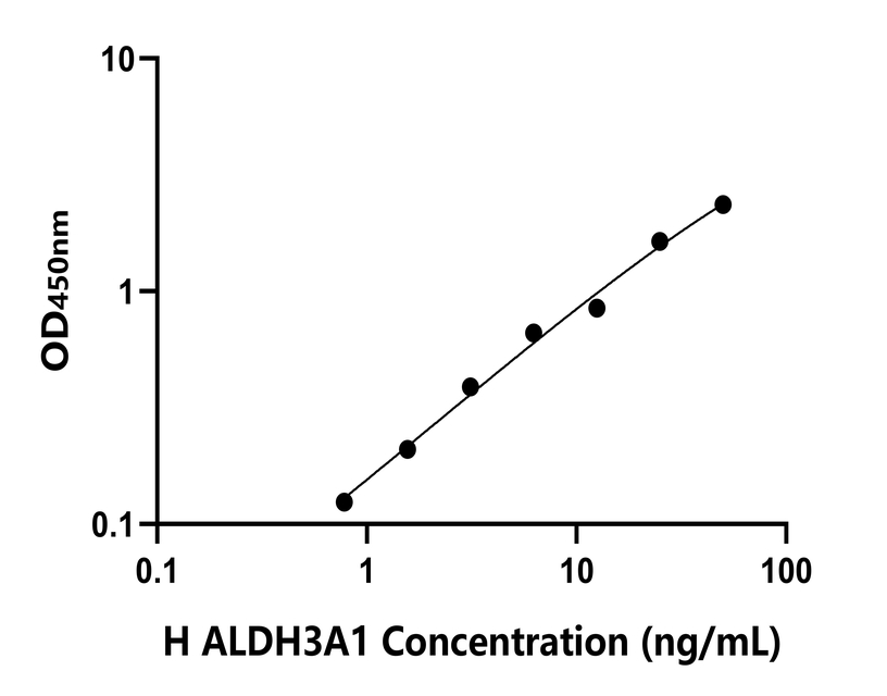 本試劑盒采用雙抗體夾心法ELISA技術 : 將捕獲抗體包被于酶標板上,捕獲樣品及標準品中的待測物ALDH3A1,清洗后,再加入生物素標記的檢測抗體進行孵育后清洗,形成“捕獲抗體-抗原-檢測抗體”免疫復合物,隨后加入鏈霉親和素偶聯(lián)的辣根過氧化物酶進行孵育,待孵育結束后清洗,接著加入TMB顯色后,若樣本中有待測物則顯藍色,加入終止液停止反應。檢測過程中游離的成分均被洗去,用酶標儀在450 nm處測OD值,顏色的深淺和樣品中的待測物的含量呈正比,通過繪制標準曲線計算出樣本中ALDH3A1的濃度。