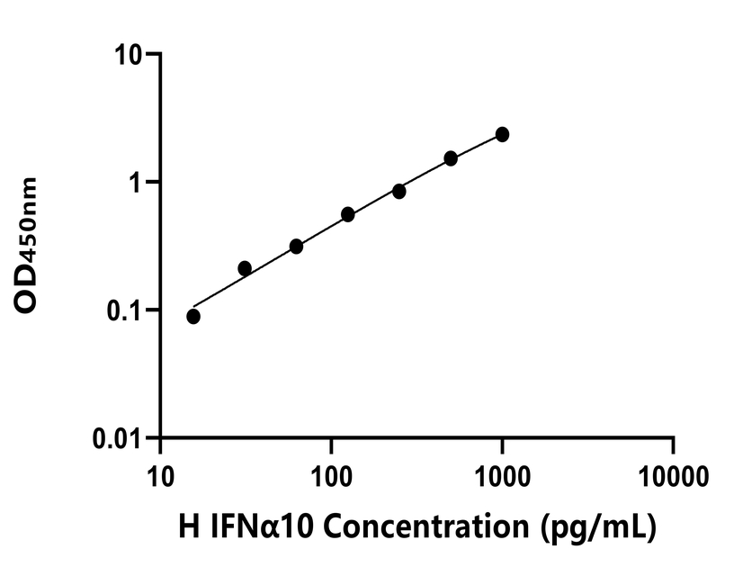 本試劑盒采用雙抗體夾心法ELISA技術(shù) : 將捕獲抗體包被于酶標(biāo)板上,捕獲樣品及標(biāo)準(zhǔn)品中的待測(cè)物IFNα10,清洗后,再加入生物素標(biāo)記的檢測(cè)抗體進(jìn)行孵育后清洗,形成“捕獲抗體-抗原-檢測(cè)抗體”免疫復(fù)合物,隨后加入鏈霉親和素偶聯(lián)的辣根過氧化物酶進(jìn)行孵育,待孵育結(jié)束后清洗,接著加入TMB顯色后,若樣本中有待測(cè)物則顯藍(lán)色,加入終止液停止反應(yīng)。檢測(cè)過程中游離的成分均被洗去,用酶標(biāo)儀在450 nm處測(cè)OD值,顏色的深淺和樣品中的待測(cè)物的含量呈正比,通過繪制標(biāo)準(zhǔn)曲線計(jì)算出樣本中IFNα10的濃度。