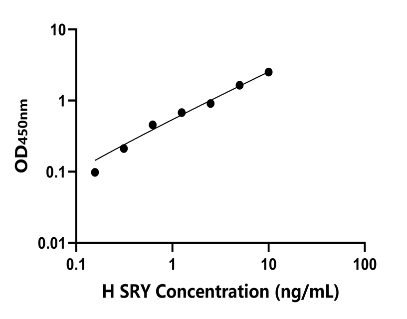 本試劑盒采用雙抗體夾心法ELISA技術(shù) : 將捕獲抗體包被于酶標(biāo)板上,捕獲樣品及標(biāo)準(zhǔn)品中的待測(cè)物SRY,清洗后,再加入生物素標(biāo)記的檢測(cè)抗體進(jìn)行孵育后清洗,形成“捕獲抗體-抗原-檢測(cè)抗體”免疫復(fù)合物,隨后加入鏈霉親和素偶聯(lián)的辣根過(guò)氧化物酶進(jìn)行孵育,待孵育結(jié)束后清洗,接著加入TMB顯色后,若樣本中有待測(cè)物則顯藍(lán)色,加入終止液停止反應(yīng)。檢測(cè)過(guò)程中游離的成分均被洗去,用酶標(biāo)儀在450 nm處測(cè)OD值,顏色的深淺和樣品中的待測(cè)物的含量呈正比,通過(guò)繪制標(biāo)準(zhǔn)曲線計(jì)算出樣本中SRY的濃度。