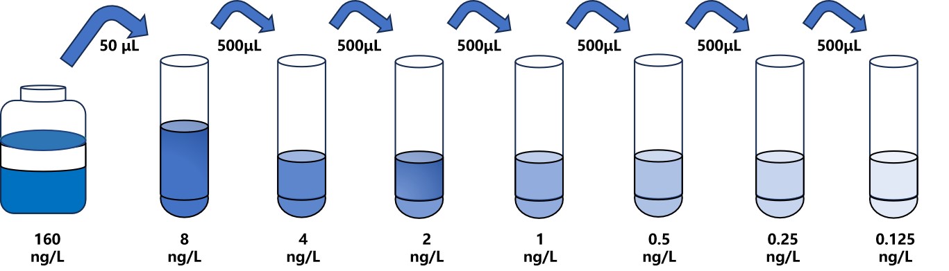 試劑盒中取出標準品,準備7個試管,先從160ng/L標準品(200μL)按需吸取一定量用1×稀釋液稀釋至8ng/L(例:50μL的標準品母液+950μL的1×稀釋液,制備得到1000μL的8ng/L濃度標準品),隨后在6個試管中分別加入500μL的1×稀釋液,在這6個單獨的試管中將8ng/L標準品依次2倍倍比稀釋至6個梯度,共配制7個濃度的標準品,依次為:8ng/L、4ng/L、2ng/L、1ng/L、0.5ng/L、0.25ng/L、0.125ng/L,從最高濃度標準品溶液中吸取500μL標準品到下一個試管中,輕輕吹打混勻,以此類推進行標準品的倍比稀釋(如圖所示),1×稀釋液用作零濃度標準品(0ng/L)。