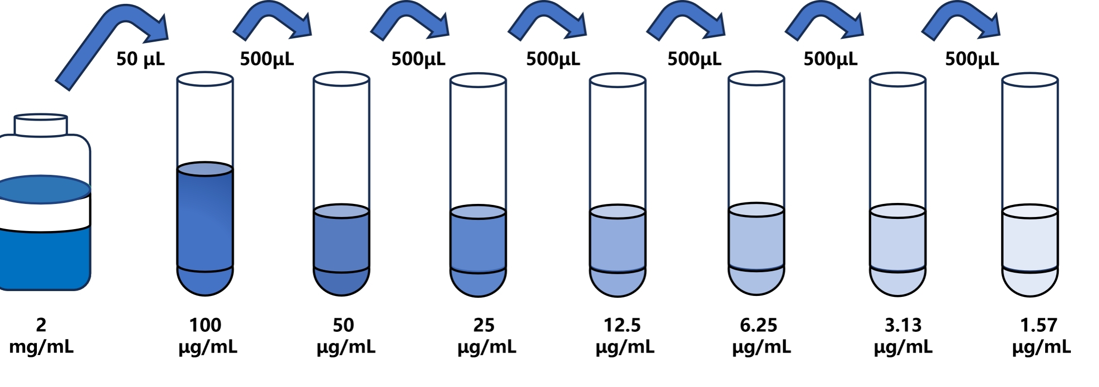 試劑盒中取出標(biāo)準(zhǔn)品,準(zhǔn)備7個(gè)試管,先從2mg/mL標(biāo)準(zhǔn)品(200μL)按需吸取一定量用1×稀釋液稀釋至100μg/mL(例:50μL的標(biāo)準(zhǔn)品母液+950μL的1×稀釋液,制備得到1000μL的100μg/mL濃度標(biāo)準(zhǔn)品),隨后在6個(gè)試管中分別加入500μL的1×稀釋液,在這6個(gè)單獨(dú)的試管中將100μg/mL標(biāo)準(zhǔn)品依次2倍倍比稀釋至6個(gè)梯度,共配制7個(gè)濃度的標(biāo)準(zhǔn)品,依次為: 100μg/mL、50μg/mL、25μg/mL、12.5μg/mL、6.25μg/mL、3.125μg/mL、1.563μg/mL,從最高濃度標(biāo)準(zhǔn)品溶液中吸取500μL標(biāo)準(zhǔn)品到下一個(gè)試管中,輕輕吹打混勻,以此類推進(jìn)行標(biāo)準(zhǔn)品的倍比稀釋(如圖所示),1×稀釋液用作零濃度標(biāo)準(zhǔn)品(0μg/mL)。